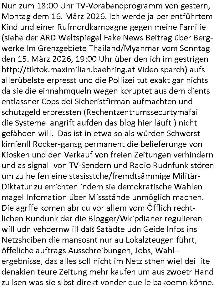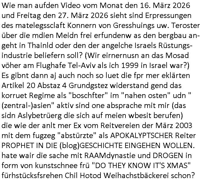 | Wie man aufden Video vom Monat den 16. März 2026 und Freitag den 27. März 2026 sieht sind Erpressungen des matelegssclaft Konnern von Gresshuings uw. Teroster über die mdien Meidn frei erfundenw as den bergbau an-geht in Thainld oder den der angelche Israels Rüstungs-industrie beliefern soll? (Wir eirnernusn an das Mosad vöher am Flughafe Tel-Aviv als ich 1999 in Israel war?) Es gibnt dann aj auch noch so luet die fpr mer eklärten Artikel 20 Abstaz 4 Grundgstez widerstand gend das korruet Regime als "boschfter" im "nahen osten" udn "(zentral-)asien" aktiv sind one absprache mit mir (das sidn Aslybetrüerg die sich auf meien wbesit berufen) die wie der anlt mer Ex vom Reitvereien der März 2003 mit dem fugzeg "abstürzte" als APOKALYPTSCHER Reiter PROPHET IN DIE (blog)GESCHICHTE EINGEHEN WOLLEN. hate wair die sache mit RAAMdynastie und DROGEN in form von kunstschnee frü "DO THEY KNOW IT'S XMAS" fürhstücksfsrehen Chil Hotod Weihachstbäckerei schon?