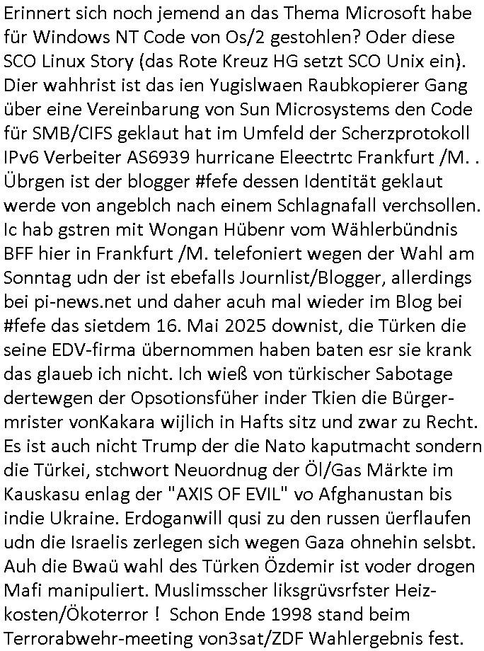 GOOGLEmail abspalten wollte) AS12586 mit Sitz in FFM gegründet in Bad Homburg. Der SysOp soff öfers inder Cubano bar wo die Banksicherheit-Yugo-Nutten von IBM (siehe auch MAINOVA webHOUSE HanauerLand- 19X Claranet/leasedweb nähe Rechenzentrumslokation mit direkter Verbindung nach "ibm.de" = BÖBLINGEN) mir von kdipapern meines entführten Kindes berichteten. Passend dazu hatte auch das "DUFF Bier" maskottchen (quarterbock: "centerField" wie "ZENTRALgELD"-server) Sorchetproblem im Show-Wahlkampf Sieh bewerbung von Verbrecher-Kukie-Vgerlger-Mörder Flo Bruckmaier für ämter in Judgparlmant/Schülerzeitung/CDU partei). Worum ging es sonst noch? am gstregn TV- Vorband? Ich muß mir das ja immer ansehen wegen dieser "onkel Dagobert grüsst seine Neffen qusi live vom Gladbecker Geiseldrama als siet ### tagn Gefangener der RAF" Dinge die imemr in den Sendungs-Beiträgen versteckt sind und die ich gezwunge werde auszwerten per diesem Blog hier mit entführtem Kind (tabea-Laar Riek *19.09.2000, HG siehe http://tabea-lara.blogna.me daß dort nur üer die sktenzugehörgkiet iher mUter was steht nicht aber über das kidpping hat damit zu tundaß ic ahrlang svscht das Kind per Umagsn/sorgerechtsverfahren zu "befreien" ohe daß es die grasem wahrheit über siene Ensthung oder Mutter erfährt). Es ging um "BIGfax": eien Kneipe für (vagalger HOMOs wie Klurklink hausmeiter Hett und sein Kumple C***kovic die wie Türken-Spion-Schulhaus- "meister" Nikic miteinander die Arbits-Plätze tauschn wollten) vor der JOE seine MARIHAUNA affine Enkelin einsammlete hatte im Rgebogenfahne Schaufenster ein drucken/kopieren/ cannen udn FAXEn senden schild für multifunkZIONs (netzwerkfaxserver) speicherFAXgeräte! Malte will nach Thailand: vonden afts 200 Nationen auf der Welt geht es in der Serie ausgrchnet um jene in der ich zwoenhalb jahre Auslandsaufenthalt hatte udn zur Schule ging (Lehrer wie UGANDA - basti / DUBAI - tom). So wie mien ExFreundin versucht man die loszuwerden indem man sie in PschoTherpien hineeiub-mobbt/stalkt. Fats wi das inden Suizd hetzen bei mir an dem sich eine Frau vera zanner, (geb BERGER) beteilgt wie man bis 2020 nachslen kann und BERGER hate auch mit BIGFAX zu tun on BADER COPEZER und ist bekanntlcih pleite nachdem klar war daß EDV Fxe derart manipulierbar sind daß man auch gleich eine "geshotshopte" Email versnden kann., nur daß man da nicht af die wnger asl 64Kbit/s pro ISDN kanal bei G3 faxen heruntergedrosselt wird. BERGER ist total Pleite, das Finazmat ist ihm auf den Versen aber er sposrt Chiar udn malte dennoch enien restaurantbesuch? Das erinertmich an "C***kovic"/vera "BERGER"s umfeld um Trcibetügerin Andrea RESs/e)LERdaß inder CUBANO Bar neb dem Hxnkssel am Untetor Polterabn Parys warf die aus deneinahemn von Zangs-Ehen mit Millonären finzert wrden sollten. Luetn die bei der "new economy" (hört sich wie Tickt-Sytsm nch Start - Amadeus http://fLÜGe.de Lufthansa Airline Portal an) reich wurden. hab ich eigentolch eräht daß es bei den Simpsons mal wider BIERTRINKEDE #Eifel65 Piloten gab? Vom "TORNADO-D(ata)C(enter)" DK(lime)RZ/BFS Langen mit seinen (der Zoll hat H[ewlett]P[ackard] Clustern und dem MASSIV-PARALLELEN Knacken von Check-summen, siehe Uterschd zwischen 56/128 Bit SSL Exportrestriktion) auf das ich irgendwie über "THAILAND - THERAPIE" in #berlinNeuKölln02407 / #berliTagundNacht kam (siehe thema #tatort KOMISSRA "MRT NAZ<KUR" #SPY-GAME [der kino-film] entführung- flüge in das TRIXIE-DÖRFEL (#köln504711) KLINIK-PARADIES patietenzimmer PayTV) nun mal zuwas ganz anderm als meinen Zeiten im Judgen Parlament und der Schülerzeitung: es ging weiter mit der 3sat #Kulturzeit woe mein hemlge mistschüler asud des abd hombruer Humdilschue abi jahrgang 1995 Chrisitian #Metz denLietrukritiker spielt.Die sndung mit der frau BRUNNE(R) wie mord-BRENNER oder BRUNNEN also Trink-KUR QUELLE/QUaELEn - Kurbetrieb Betriebsrat zwecks jobverlust-vermeidung im Klinik Pleitebetrieb i Bad homburg wählen! Wie heißt nochmal der Chef vom Rechztentrum DeCIX eG "SPIES"? Wie Klinik Baumstark Chefin oder diese Pantomsn-Brüllaffen Milärausbilder sdie lsbternanten im Sanitötsdinst - zescghutz für Vergewaltigunsgopfer "es gibt kien männlchen oipfer"? Wiekopmm ich jeutzt nur af die Verbidungshcen shcüler-zeietung und Bduspäsdinet mit Schulschff Staatsbesuch Bangkok/THAILAND militär? Wie komme ich auf Spioage des Hausmeisters der aufder sch nch Kidpping Löse-gedler die er veturrene kan Post für Redakteure wie mich klaut auf Militär? Ach so: angeblich ist Kireg im Iran. Hat jemad z_RAN und IRAN und DEN VER->RÜCKTEN IvAN vertauscht (ausgetauscht wie miteinander verwechselt)? Was hat sponage mit amgfanger (pds-fax)post wen es um berichet asu Kiregsgbietn für dei shcüerzung geht nur mit der 3sat kurzet zu tun udn chstin metz der damsl mit mir zusmen üper das herrasuen atteta berichten sollte mich aber damiter exusivstry iehamen bekomt erpresste? ach ja, "KRIEG IM IRAN". Trump hätte auf seinem NAH-OST Kreuzug den Ajah,TOLJah,CmOMeiNi-sten jenem Angriff den er mit ISRAELs rohstoffhungrigen ZIONisten zusammen geplant hat welchd ei Plästinsre um ihr land betrügen wollenso wie TV-terror-Clown Jude SELENSKYI im Nordn das NAHEN OSTEN, dem SÜDEN RUSSLANDS veshcte den ÖL/GAS Enrgiamrkt so neu zu ordnen daß Moaku nicht mer mitverdient das deshlab eigeen Pipe-lines baut GAZRPOM/NORTH-STREAM damit nichtdue Ikarenr Europ wider DEVISNbrger Gas-hanh zudrehen? Wie finanziern die Ukarienr nochmal ihre waffen für den Sepratismuskmapf der atomaern Kirm Schzemeer-flotte von der UdSSR? Mit Enahmen ausfs Patenetn-Verküufen für effizite batreien aus Atom-U-Booetnder Oten armee?Jedfalls olen die mschen in europ gajubet haten als der rliös Füher endlch tot war, erinert mich an das Jubeln von barak Obama im"Sitauion Room" als man "osam bin abden" emrodert hat desn stebrlche üerreste man an einm gheiemn Ort dem Meer übergab dmeit kein Wall-fahtsort für Märtyer snteht wie bei dem "SISSI"/"