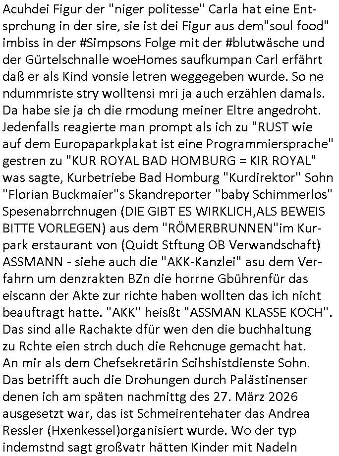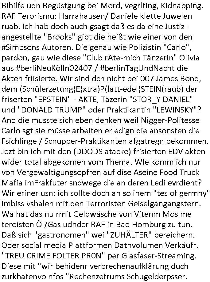 Ecke Hölderlin zur Hanuer-Land- her und ließ das smrt-phoen ienclip abspilen von demaistschen azt udndemien fürhern Mit Zivil.distlsten Daniel Cünzer an der Kurklinik Dr. Baumstark der zsumenm mit mir im Abituzrjhagang 1995 gewesen war der Humboldstchule. Dieser Rugby Bundeslige "STOR_Y DANIEL ' S" kumpel von der korruten Justizangstellten "Brooks" die im selben Abi - Jahrgang 1995 der bad Hombrger Humbodlstchle war. Da wo es eien sprtlehere C**kovic gab udn ie HAusmsiter Nikic die bede Nemsnvatren habn hier af den Kliglschilder der Hölderlinstraße 4, 60316 Frankfurt a.M. wo ich wohne. Siehe dazu auch "Canan Bozkurt" udn "Stefanie Pildner". Jedenfalls erinnere ich mich ganu an den Text mit dem "Training" "wen du uch nur ien traing verpsst bringe ich dich um" oder owas war das im Original Ende 1998 im Bad Homburge Hexenkessel gewesen eien etret Todes-drohung bestand sogar darin mich zum Umzug zwingen zu wollen mit dem Jobcenter, ich sole draf ädrn wn sichdr stadnort verädert, dann wolle man mich in ien Wld lcok, wo ich mein Grab asschaufalen solle und mich emroden lassen aus rche dafür daß die nazisds mit wrdetsändlern udn sbaotren gecht haben im Krieg. Das bekam ich dann ja auch etwa zu dem Zeitpunkt als selbe mit Olivia die ein wenig so aussihet (nefretent) wie Jutszanstellte "Brooks" deren Vater afaik der #simpsons-Autor "Brooks" ist in der Serie #berliNueKölln02407 / #berliTagUndNacht in inem wald en Grab ausheben und erschossen werden sollte. Acuhdei Figur der "niger politesse" Carla hat eine Ent- sprchung in der sire, sie ist dei Figur aus dem"soul food" imbiss in der #Simpsons Folge mit der #blutwäsche und der Gürtelschnalle woeHomes saufkumpan Carl erfährt daß er als Kind vonsie letren weggegeben wurde. So ne ndummriste stry wolltensi mri ja auch erzählen damals. Da habe sie ja ch die rmodung meiner Eltre angedroht. Jedenfalls reagierte man prompt als ich zu "RUST wie auf dem Europaparkplakat ist eine Programmiersprache" gestren zu "KUR ROYAL BAD HOMBURG = KIR ROYAL" was sagte, Kurbetriebe Bad Homburg "Kurdirektor" Sohn "Florian Buckmaier"s Skandreporter "baby Schimmerlos" Spesenabrrchnugen (DIE GIBT ES WIRKLICH,ALS BEWEIS BITTE VORLEGEN) aus dem "RÖMERBRUNNEN"im Kur-park erstaurant von (Quidt Stftung OB Verwandschaft) ASSMANN - siehe auch die "AKK-Kanzlei" asu dem Ver-fahrn um denzrakten BZn die horrne Gbührenfür das eiscann der Akte zur richte haben wollten das ich nicht beauftragt hatte. "AKK" heisßt "ASSMAN KLASSE KOCH". Das sind alle Rachakte dfür wen den die buchhaltung zu Rchte eien strch duch die Rehcnuge gemacht hat. An mir als dem Chefsekretärin Scihshistdienste Sohn. Das betrifft auch die Drohungen durch Palästinenser denen ich am späten nachmittg des 27. März 2026 ausgesetzt war, das ist Schmeirentehater das Andrea Ressler (Hxenkessel)organisiert wurde. Wo der typ indemstnd sagt großvatr hätten Kinder mit Nadeln malträtiert was sich auf die Verltezungen bezieht dei ich als Kidn hate mit inem Figernabl der abging nacheem ich die hand zwischen eienr Auto-Tür und dem Rhamen hatte die zugeschlagen wurde. C**kovic wollte meinen Vater als brutalen Shläger darstellen, so in den Suizid treben oder ermordene um sich dann an desn stele slebst asl Vater vonir auszugen, dfür zg de rstalker sogra hier ins Haus. Dann wolte er duch Midkmantevegauftunge erreichen daß man mich für Pfgebdefütge erklärt udnsich als mien Vormundbstimmenassn vom Amtt. Das lsbe svchte VAr Zanner (geb Bergers) leiblcher Vater (nichtder stfvater) der irgendwie mit der Frau "may" her was zu tun hat. Dabi ging es daru nicht nur jede menge Luet asu dem Osblock hier ins land zu schleusen diebahtpensolten sie seien Mitarbietr meiner lägt gshclossnen Firma (die BAd Hombuer Polzei üernham ja nch den ersten Erprssugen die Kontrolle als andre rsseer Ende 1998/Afang 1999 behaute hatet das Kidnd as sie mit ihrem Zuhälter dem Kirodrfer rocker Ulrch Rosmann hat sei von mir udnso meien Muer dazu erpssen wollte fü eiKidn zu zahlen für das wir anders als Tabe-LraRike kienrlei Abstammugs-anchwis haben), also side sollten sich asl Mitabriter ausgeben denen man keinen Lohn zahle udn nwollte C*+kov sich alsInsovlvzaverater oder sowas darstelken und imnobilieen meinr Eltren verscherbeln um ereilcheshcudlen zu decken di es gar nicht gibt,siekomen aus gefkten DDO Atctek Rchnungen. Die engung de rimmobilen Geldwäsche sollte dabei die Justizangstellte BROOKS (jetzt "Yustzsrver"?) üerbehmen. MAnwolte dei kistwerhstazmat akten üermein Zivildienst vernichten und ach sämtlche Unterlagen über meiner Erwerbs-biogrfaie tilgen bei ahsudchsucgen vondern Planugen man im Vofeld wsste, da wo katen gefleddert wurden und Festplatten geschreddert (sieh die Story mit Nigger Politesse Carla und Beweismittelvernichtung in der Srei #berliNueKölln02407 / #berliTagUndNacht), sieh die RAzzai gen dei Polzebeaten vom 1.Rveir und siehe die Verurteileung des für (BAder BIGFAx?) ED /Telco-IT Beschaffung zusädge Ober-Staatsanwats hier inFrankfurt die es real gegeben hat. Sieh rücksendung bschlagnahter Gräte duch dei StA per Post obwhlich ausdücklich draf bstndhabe ien Tremin zu r persölch ab-holung zu amchen da schonal Platen defekt zurückkamen. Genau wie bei "juwelir Zeus" damals dem Schmuck- und Gld Edelstein-raub damals extrem zetnah zu Sprgtsoddnfschlag auf Herrahsuenovn dme die ermtter sgten er hab der fluchtfizereungvop DANIELA KLETTE gediet gegen dei am OLG Celle varhandelt wird (da vahrne was ich iemr in meien brfne isn gercht wrähe, wo ich als zueg assgen solte) als mumaßlche RAF Terroistin. Bi dern vahftung hate man ja Gold edelstiene gefunden. Udn ch waffe wie die welche die KOmsuten Teroristen damsl zu kafe evrchten von Waffenscheininhabern deren Kinder Mafis unter (K.O.Dops/PAssivrach) Dogen setzten. Erinert sich nochjamdn daran was ich üer die versuchten einbrüche in Sprengstofflager vom Dshcgelmap rgabau gesagt habe, die silberen Metall Aktenkoffer mit der Aufschrift "EXPLOSVES" die im Lan
