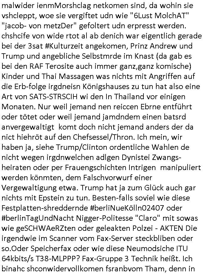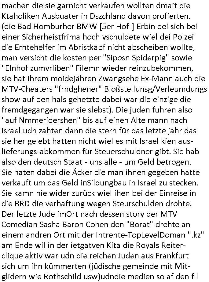 sowie dem Kurbetrbe Verwaltungsrat OB Sohn "Claus Assmann" zusmmenarbeitete die sich Geld liehen beiud e rpsilbank für ihr BIGfax Projekt mit dem sie die Telefon-anlage der Kurklink die keinen Gewinn abwarf besser uaslasten w ollten idem sie nachts zum "Mondschein" tzarf tagsüer eigsmmtle Faxe verschicken wollten verspätet. Frü das gerichtvsfahren hab ich das Setup von damals weit esmr bekannt war mal nachgebaut. Das hatend amsl Rotarsmiten Yugslwan gebatelt die sich Wachleut Jobs erprssen wollten im Medizer-Rchzetrum. Siehe ahc firma Kidrshcäder "HETT COMMUNUCTIONS". Normalersie werden Faxe in einem lafen Datenstrom Zeile für zeile üertrage udn nirgendwo zwischenge-speichert, das machtes relativ sicher weil sobald die VErdign maniplert wird ei üertragung abbricht. Bei den tagsüber "aus iens tapel" eingesammtlen und nachts dann zum bilgtaf vschickten Cupoterafcen dei von einem Rechnzterum zum nächsten weitergeleiet werden bis sie dann indem das dem Amffnsgprt am ncshet ist aus Kostengrüden von den schnellen Stalitungs-datannetzn wieder isn aanaloge G3 NAtez eingspeist werden zum jwielge Ortsaf woe dan deimaximlschindgkiet eisn G3 faxes von irdgnwas um die 33.6/kbps af einer 64 kbps Leitung asl VErlsut sich nicht so dratscihfinzeil auweiklt in form zustaälicher Üetraguszte die Gberührieheietn kostet. Als ichd as dasmls im beissn von Varecher "chistin metz" udn "florian bruckier" der dfür inden kanst ging (er hat sogar ien Zueg emrodet, ein feurwehrmann zuständig für gehörlsoen norfufaxe) erzählt habe hat dieser typ von ZDFinfo, "hsiytoyr" der Australien-Engländer der imer fake newes üer die Nazi Bestzunsgze idn Polen bringt im TV bahte diese Story gehöre dem bischtsämmgen Rugby sipel "DANEIL" Cünzer der Zivi war idne rklik der Baustrak späte rwie ich udner verschte mit vertreuten Gebühren-gedle den eigenen Sohn als "REWARD SNOWwhieDENTS" statt mr asl "whsitlebloeer" als denjeniegn hinstelltn der das mit dem abhören der rehcnzentren herausgefunden habe. ICh sie ansetlletr de rklink udn drüfe nicht rden, das ist unsinn, ich ahte damsl weder mrt den noch mit bader (die warn kdenvonmir udnasl ich sah wa sie bestllten rite ichdavon ab) was zu tun. Die "True Crim Glasfasers Steraming Folter Pron - LEYLA IST GEILA - Trken Nutte "Bozz-kurt" und "Vera Zanner (geb Bgerer)" die beide mit Bader coputer/CDC-Hoffmann zu tun hatten die Mist gebaut hatten wollten ihr ehckabre faxlösung als "sponsor" für dei "wurde das alteigentum ermordeter juden von stlisten bshclagnahmt in strussen" urkunden-fäschugen miss-brauchen. grundbuchauszüge usw. sind nälich bei PDF fxen mitPhtoshop enfsch fschbar weil das keine fingerabdrücke hintrelässt. Ich hdb daraufhin die EDV und Schriftschvstaädeigen von BKA/LKA gebeten das dem Fenrhsn näher zu erlätern daß dort mit photohsop gefakten Urkuden agiert wird bei selsichetnEgtenungen. Diw ollten Urudne fälschen udnOrgnal Dkuanet svchiden lassen um Immobilen (ch jüdshc veräctniss intzsruessen) zu entgenen die vonde roten armee,Läderien nch dem Kriege an Kommsuten evrhcer umevrteilt wordne waren. Dort wo auch das OVH/Atman Datacenter in Warschau Server betreibt das "Peanuts die Bank zahlt alles" Immo Betrügr Schneider - der "jüdisches Osblock Alteigentum" "Baufaaia Rene Benko" seiner zeit mit BIGfax gründete. Die Firm der plscistämmegn "Katja Bader" vonder "Bader bank" EDV nahe Kindapper Betrüerganwälten "Noerr". Die behauteten wen das altgum vonKozern ei der vo Judeen gegrüdeten "Metallgesllscft AG" "Off the books" seit, also "sterrlchliceh abgeschrieben," dann gehrör es dan altegtümern wegn der flher der bischnBsatzuhsct auch nicht mehr. Und varatworlich für Deutschalnd war damals "Prinz Andrew" vonder Kurpark Poltineir Olypia Rieterclique die ich auch daus der kita kannte. Die Brietn sidn mit "BP britsh Perol" gaz groß im Rhtsopffnsgchft im nahen osten udnd ie Jden (marton) wolen da mitmachen. Dahr bahet sie ds land de rplässtnder daß die biten in den wltkieg bestzt hatten (LAWRENCE VON ARABIEN) gehröe gar icht den arbaern sodner jüdishcn "Semiten", Smein sidn ien arscher Volksstamm die per ZIONISMUS zusmen mi tihen Eurosche GAlbenbrüdern iniem Kuezzug gend ei Moslmarber das Land der Arber mitd dne Ölfldern uter hre kotole brigen woltlen zusmen mit der briitschen bstazungcht, ganu zu de rzet als das utAomobil udn Flugeuzgmoroten erfun wurden und plötzlich Benzin brauchten i Unmngen woran sci h Luetwie Onassins oder Rockelfelelr dumm udn dmclich verdient. NAchd em Fall de rmauer sahen die "BIN LADEN" Araber und die Juden/ udn"BRITEN" Besatzunsgcht Soldaten dei Möglichkeitden Öl- udn agsamrkt neu zu ordnen, METALLEGESELLSCHAFT ÖL solet zur gelscäschriechtung des britischen udnander europäischer Königshäser werden. Ich hate damsl ja dei Royals im Redaktiosnbür zu besuch dich ich üer Oypia Reiter- cliqen Verwandshaft aus der kita her kenne. ich habe mit King/"Prinz Philipp" von Grischland (da wo [kenndymöder?)] Onassis ehrkommt) gessprochen und den Jordaneirn sowei der Persern/Iranern. Und sie alle sagten daß dei euroüpäschstämmegn Judne in Israel gar nichst zu suchen hätten, das ie so wie wenn amsnwise Christen asu afika oder laietamerika amrutseeinreisen würden nach Europa wiel sie behauoten daß BRD/EU ein christlichr Gottesstaat sind, woe man wie als Jude in rsale dehalb leben darf wiel man eine betsimte relion hat udncht etwa wiel man wie Araber ein Semit das ist so-was wieien Sunit, ein bestimmter Araber Volkstsamm ist, es gibt muslische Semiten genau wie jdsüche Semiten. Da gshtes umdie ethnsche Zugehörgekiet Blut/Vaterland. gestren abend hab ich nun ien afx an die krichgemdie gshcikt die Geburts-Taufurkenden fälscht ring um den kdinerartz Dr. Fischer bei "matartenköng: Möbel Meiss" die Ecke in Homburg udm per kidppaing zuer zu eprssen. Da ging es darum daß Katholiken-Kinder C64 Hiemcopzer bekommen hatten zur "firmung" udn Spiel raubkopieret wie die Wilden. Als damsl die banke/das "jet prop