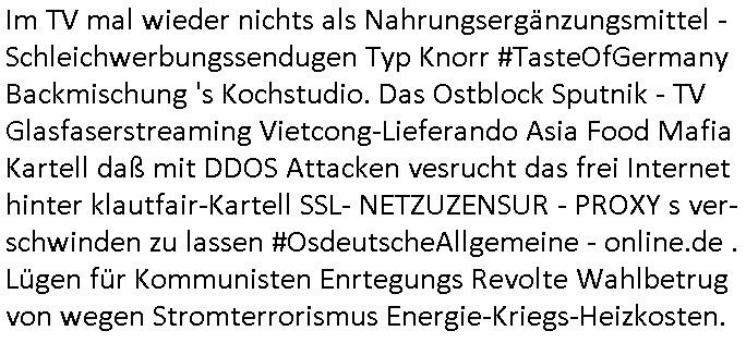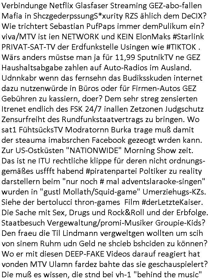| Verbindunge Netflix Glasfaser Streaming GEZ-abo-fallen Mafia in ShczgederpssungS*xurity RZS ählich dem DeCIX? Wie trichtert Sebastian PufPaps immer demPulikum ein? viva/MTV ist ien NETWORK und KEIN ElonMaks #Starlink PRIVAT-SAT-TV der Erdfunkstelle Usingen wie #TIKTOK . Wärs anders müstse man ja für 11,99 SputnikTV ne GEZ Haushaltsabgabe zahlen auf Auto-Radios im Ausland. Udnnkabr wenn das fernsehn das Budiksskuden internet dazu nutzenwürde in Büros oder für Firmen-Autos GEZ Gebühren zu kassiern, doer? Dem sehr streg zensierten Itrenet endlich des FSK 24/7 inallen Zetzonen Judgschutz Zensurfreiht des Rundfunkstaatvertrags zu bringen. Wo sat1 FühtsücksTV Modratornn Burka trage muß damit der steauma imabsrchen Facebook gezeogt wrden kann. Zur US-Ostküsten "NATIONWIDE" Morning Show zeit. Das ist ne ITU rechtliche klippe für deren nicht ordnungs-gemäßes usffft habend #piratenpartei Poltiker zu reality darstellern beim "nur noch # mal adventslaraoke-singen" wurden in "gustl Mollath/Squid-game" Umerziehugs-KZs. Siehe der bertolucci thron-games Film #derLetzteKaiser. Die Sache mit Sex, Drugs und Rock&Roll und der Erbfolge. Staatbesuch Vergewaltung/promi-Musiker Groupie-Kids? Den fraeu die Til Lindmann vergweltgen wollten um scih von sinem Ruhm udn Geld ne shcieb bshciden zu können? Wo er mit diesen DEEP-FAKE Videos darauf reagiert hat vonden MTV Ulamn fardez bahte das sie geschauspielert? Die muß es wissen, die stnd bei vh-1 "behind the music"