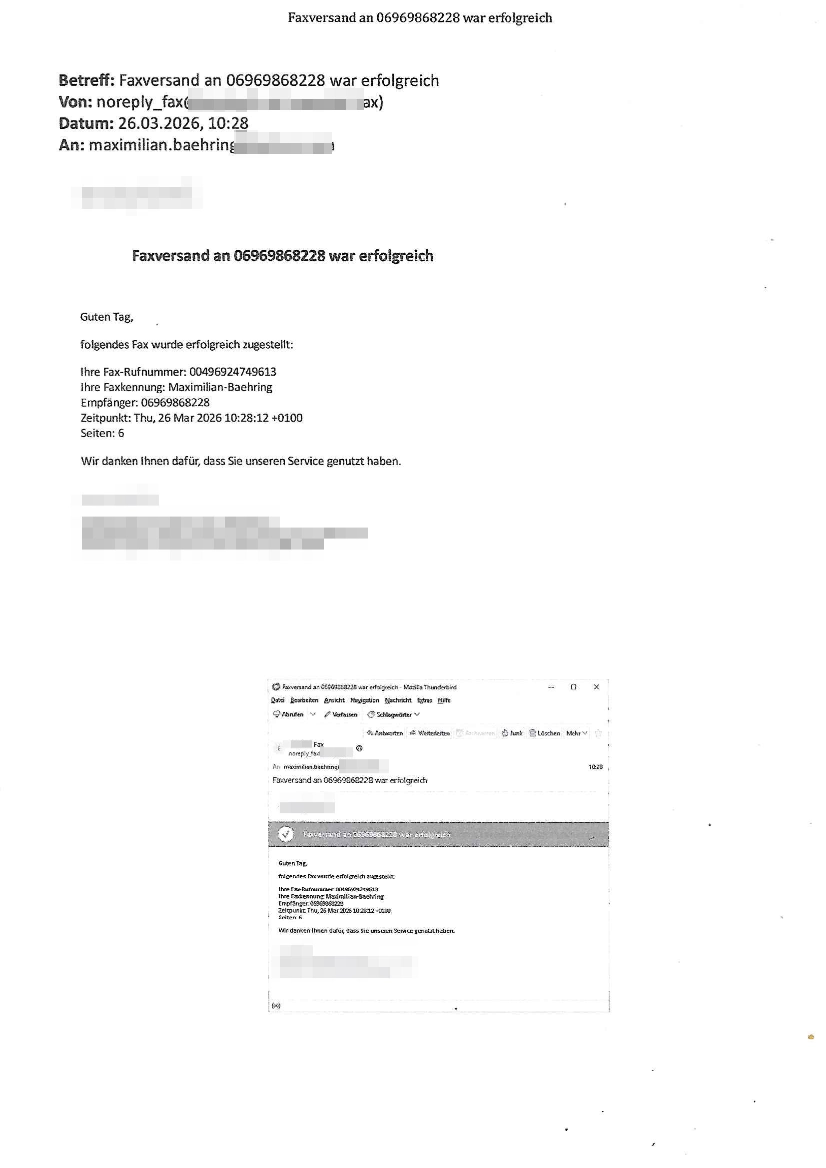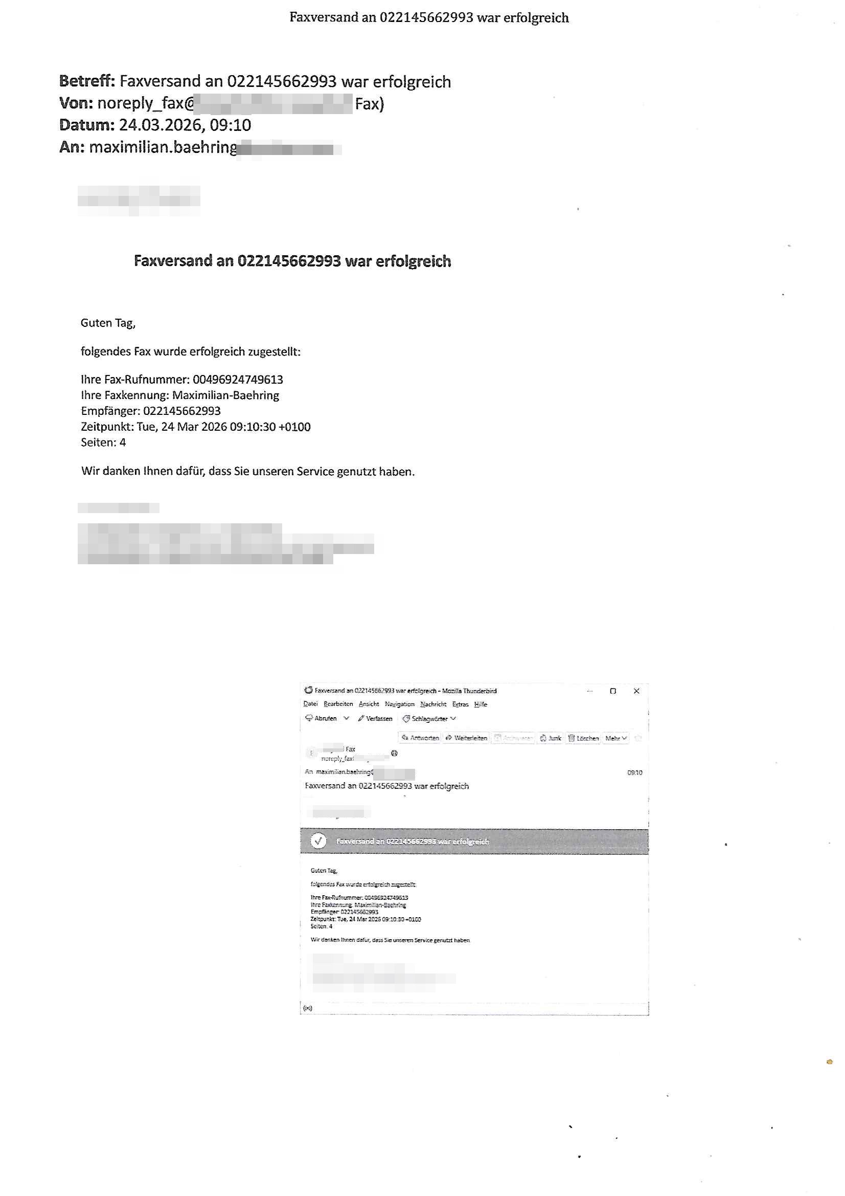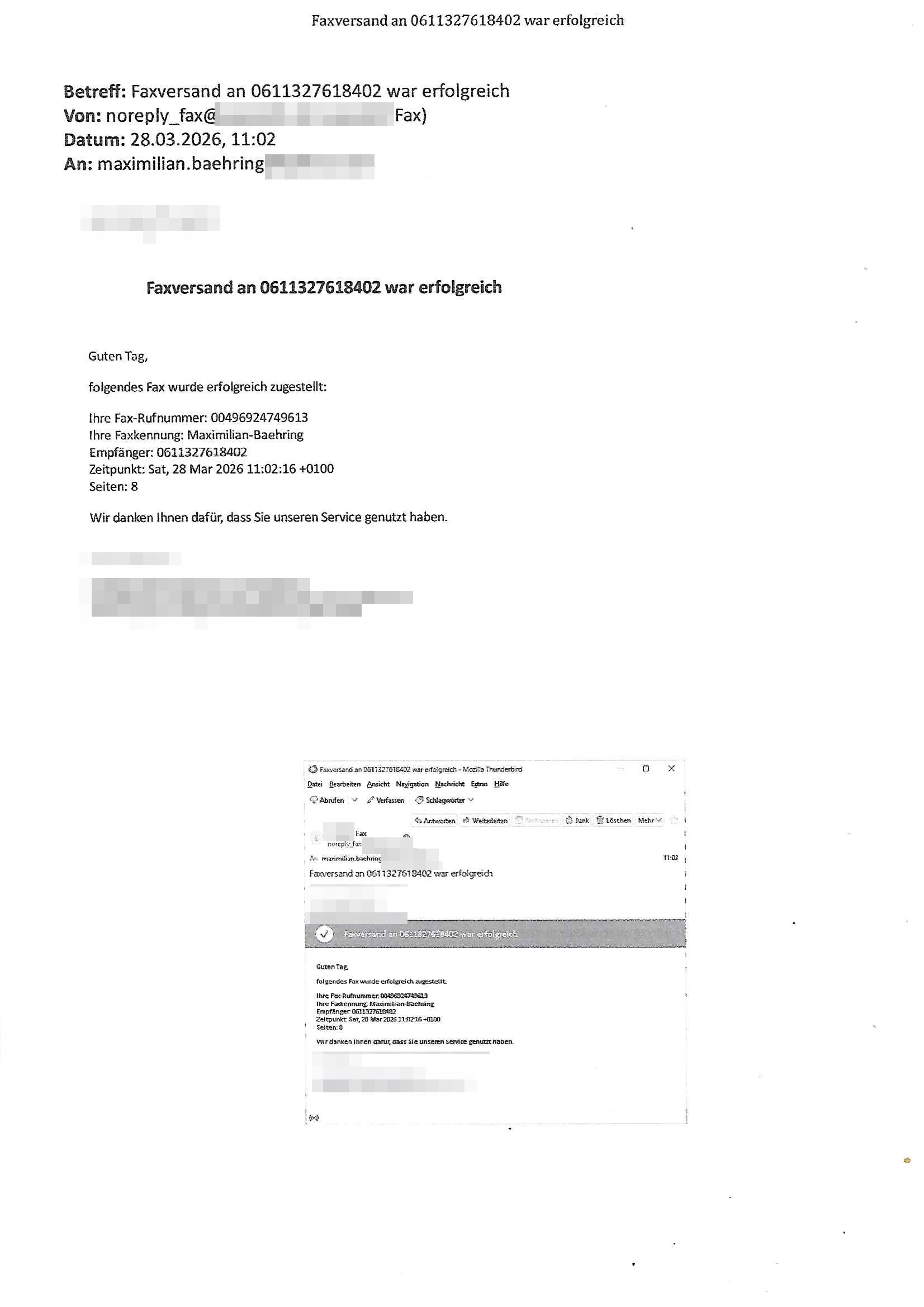 Betreff: Faxversand an 04821661777 war erfolgreich Datum: Mon, 30 Mar 2026 03:57:44 +0000 (UTC) Von: Fax <noreply_fax@> An: maximilian.baehring@ Web2Fax Faxversand an 04821661777 war erfolgreich Guten Tag, folgendes Fax wurde erfolgreich zugestellt: Ihre Fax-Rufnummer: 00496924749613 Ihre Faxkennung: Maximilian-Baehring Empfänger: 04821661777 Zeitpunkt: Mon, 30 Mar 2026 05:57:44 +0200 Seiten: 2 Wir danken Ihnen dafür, dass Sie unseren Service genutzt haben. | |