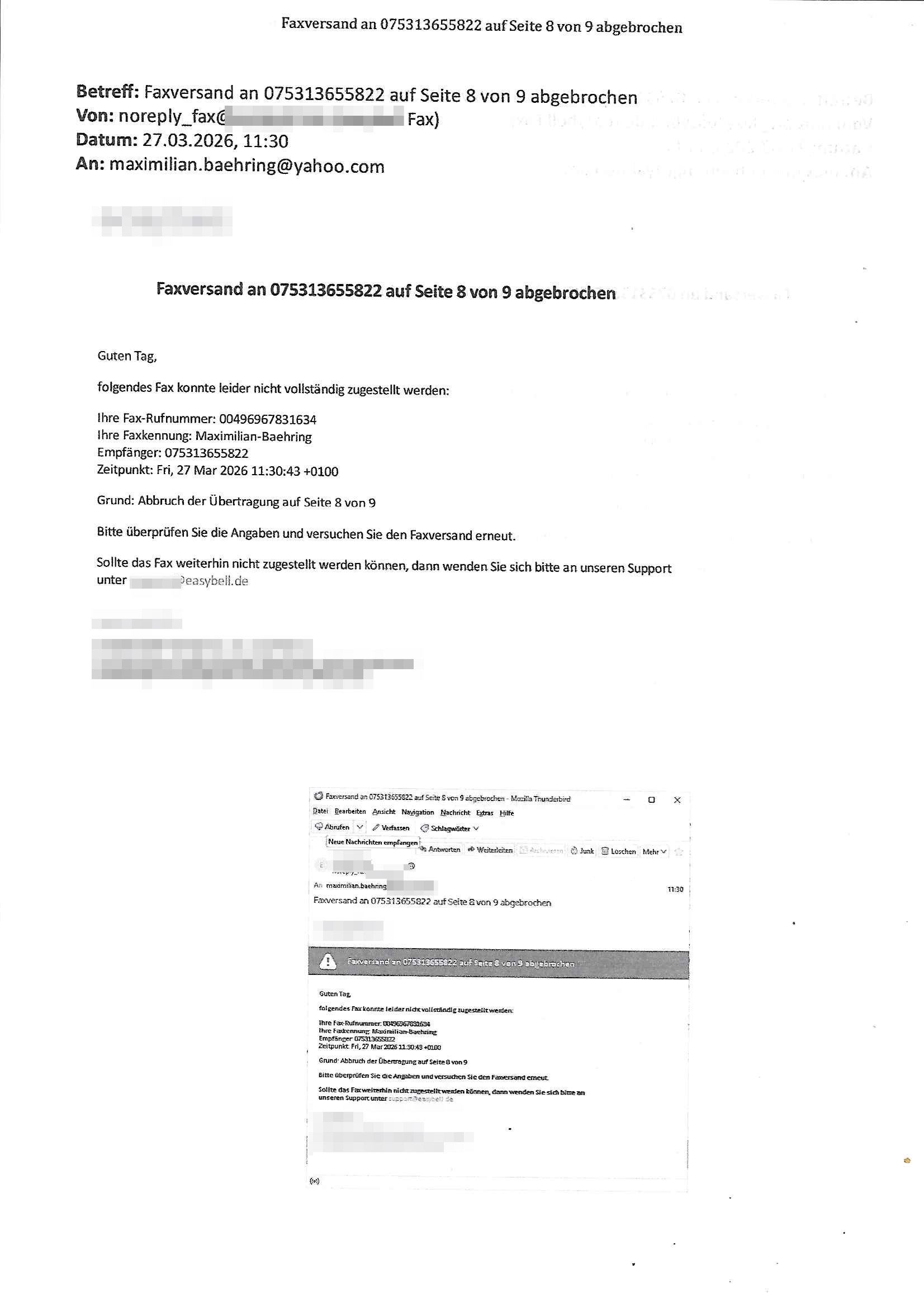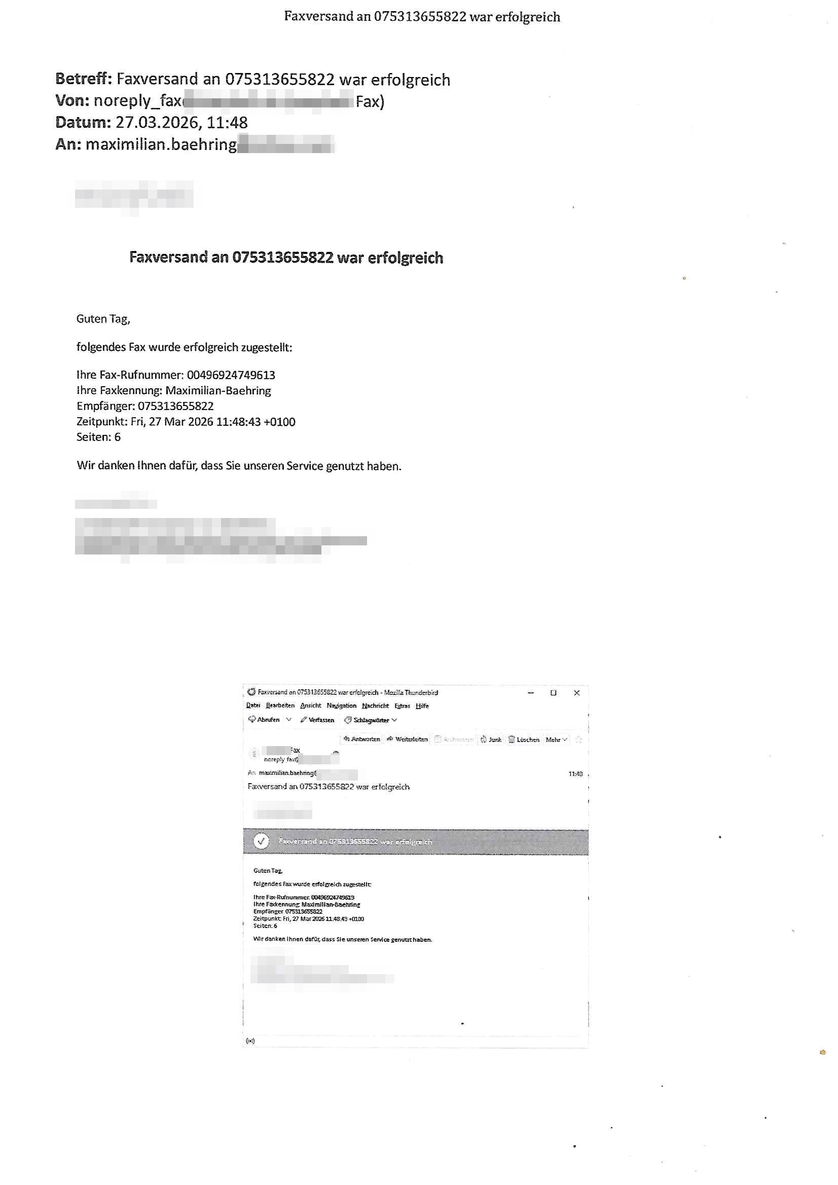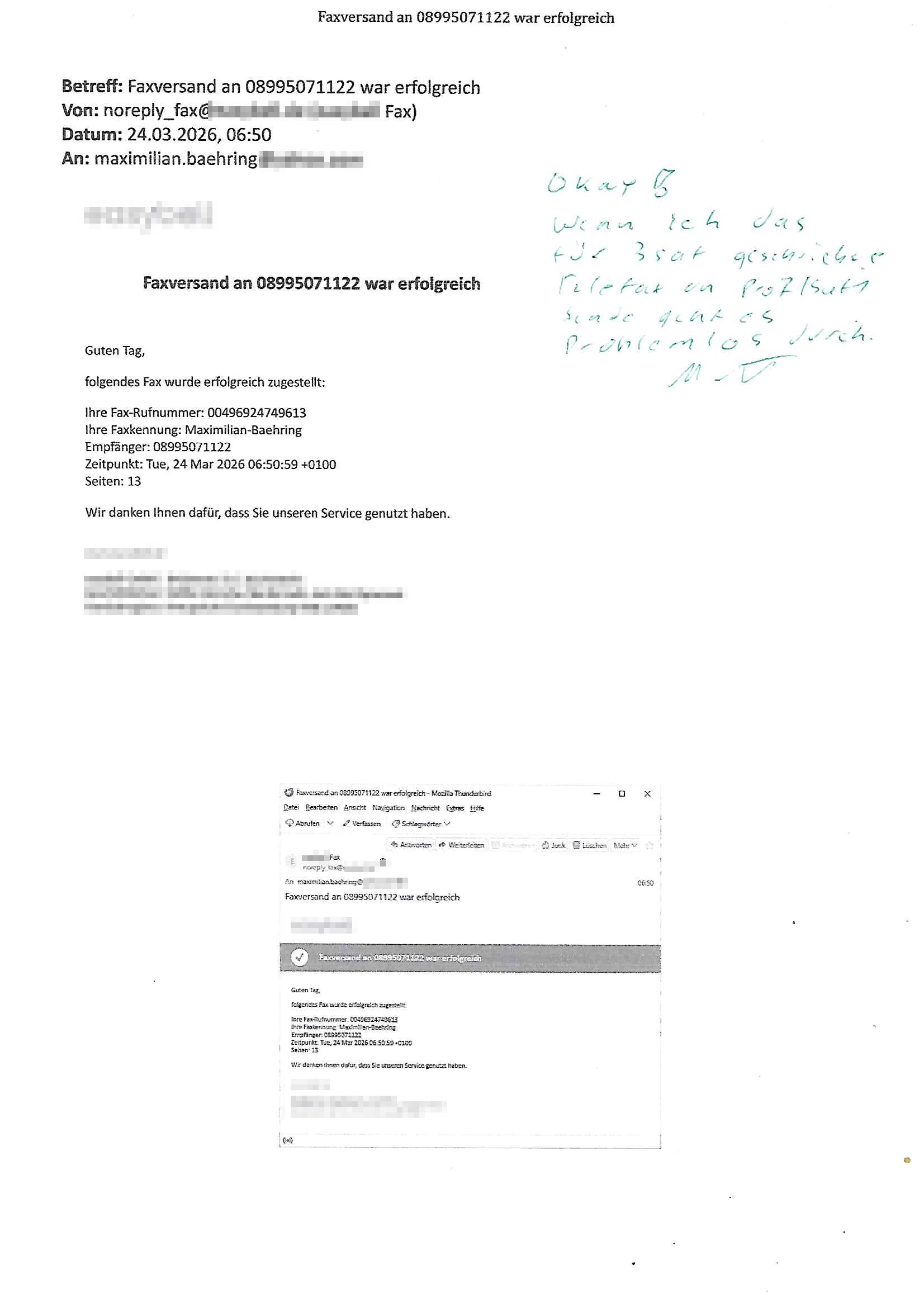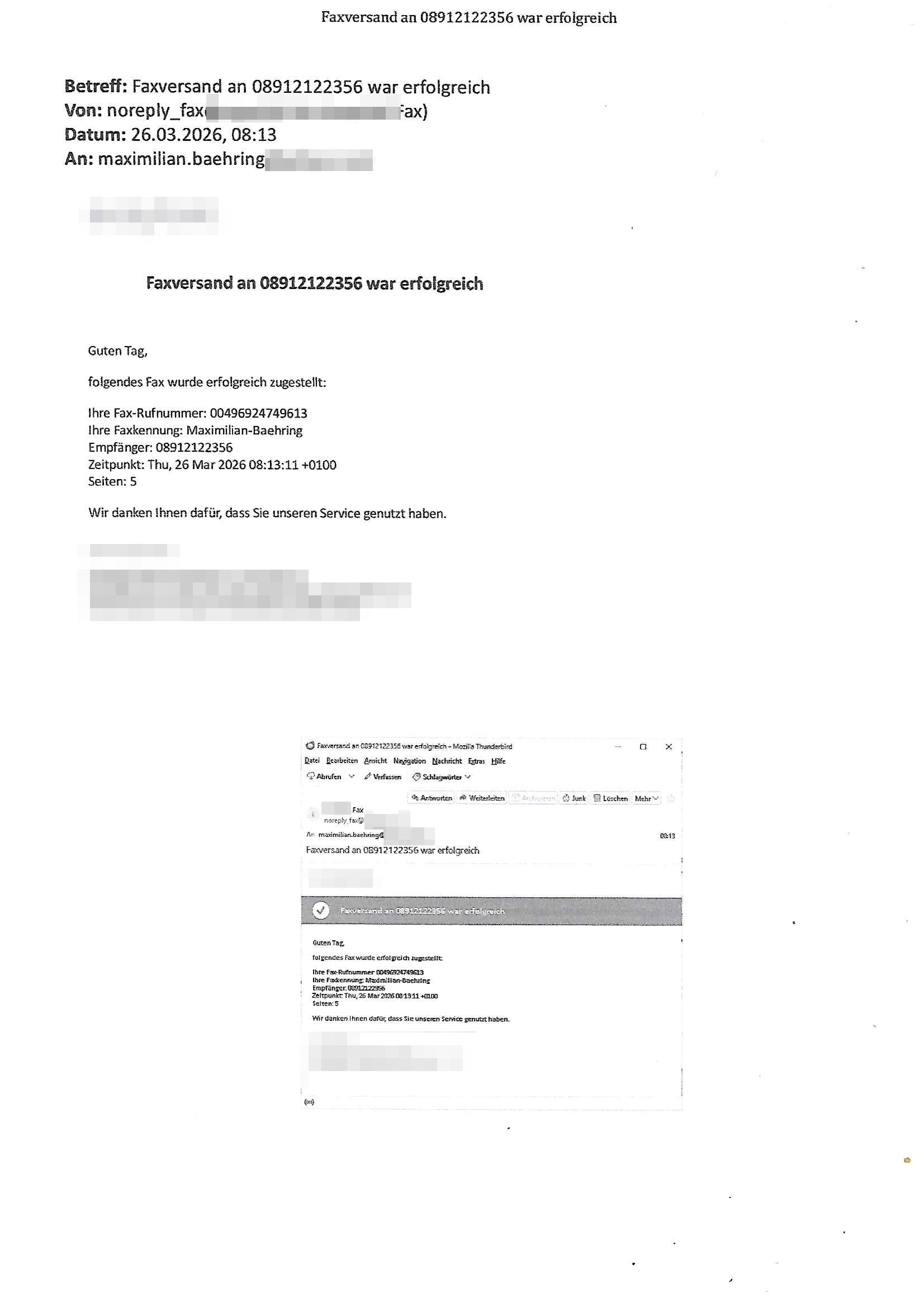 Betreff: Faxversand an 04821661777 war erfolgreich Datum: Mon, 30 Mar 2026 03:57:44 +0000 (UTC) Von: Fax <noreply_fax@> An: maximilian.baehring@ Web2Fax Faxversand an 04821661777 war erfolgreich Guten Tag, folgendes Fax wurde erfolgreich zugestellt: Ihre Fax-Rufnummer: 00496924749613 Ihre Faxkennung: Maximilian-Baehring Empfänger: 04821661777 Zeitpunkt: Mon, 30 Mar 2026 05:57:44 +0200 Seiten: 2 Wir danken Ihnen dafür, dass Sie unseren Service genutzt haben. | |