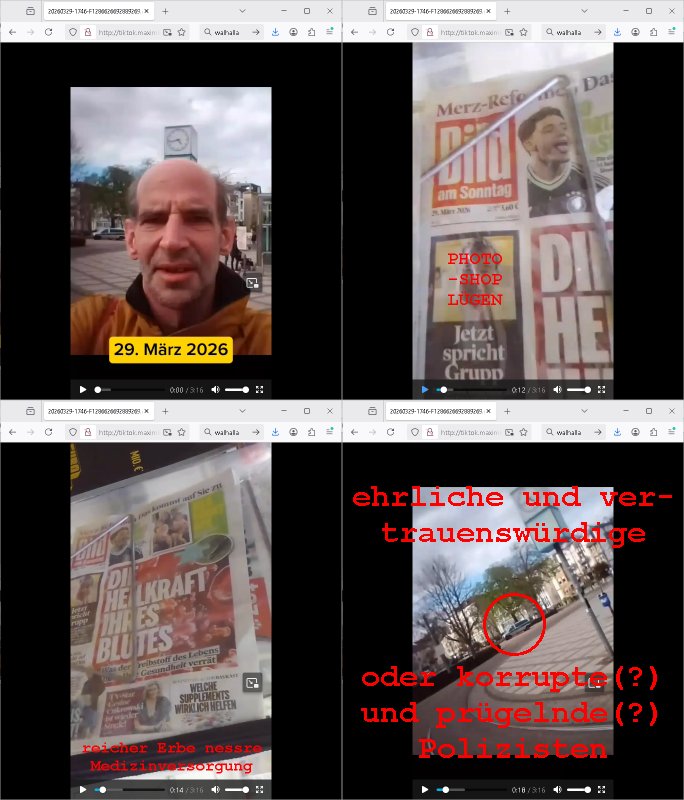 | Ich habe gestren repeoektve heute bis um 02:30 Uhr in der Früh Systeme konfiguriert und bin deshalb nach nicht mal 5 Stunden Schlaf erst nach 07:00 Uhr wachgeworden umd annwietrzuchen bis zimlch exakt um 14:00 Uhr und da war ich dann endlich soweit fertig mit den Sabotage bedingten umfagrichenren rbeiten zum Monatsanfang als sonst üblich. Dafür hab ich diese ACME - Bot SSL Sache noch fertigbekommen von dem Fax - Serversystem von dem ich berichtet hatte das ich Demonsttationszwecke- bei Gericht wegen maluafgbaut hate und mit umziehen musste als ich den Provider in Oseuropa whcslte wo es in letzter Zeit häufig Ausfälle gibt die eines meienr Backup - Systeme ( etwa dei http://193.19.133.9:8080 ) betreffen. Daher komme ich nach zeoStunden erschöpf-ungbdinger Ruhepause erst jetzt dazu kurzwas zu dem #Tatort Krimi vom Sonntag den 01. März 2026 zu schiben. Der fing später an, es gab eine Brennpunkt oder sowas sonder-sendung weil im Iran der Krieg ausgebrochen ist mit den USA. Als es dann losging bekam ich nur soviel mit daß es umien Frahradkurier ging der zur Polzeistation kam um ne Selbstanzgezu machen aber dann irgendwie wieder weg-gschickt wurde udn dann vor dem Gäde von einem Auto überfahren wurde,wohl mit Absichht. ICh dcheterst den Film habe ich schonmal gesehen weik es schonmal was gab mit Fahradkurieren und den EDV - Daten von denen anhand derer man sich Hinweise erhoffte auf die Täter. Schon damals ging es um irgendche "Scanner".