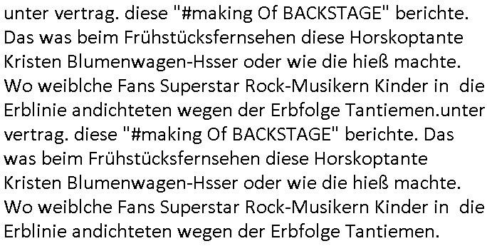 unter vertrag. diese "#making Of BACKSTAGE" berichte. Das was beim Frühstücksfernsehen diese Horskoptante Kristen Blumenwagen-Hsser oder wie die hieß machte. Wo weiblche Fans Superstar Rock-Musikern Kinder in die Erblinie andichteten wegen der Erbfolge Tantiemen. | |
