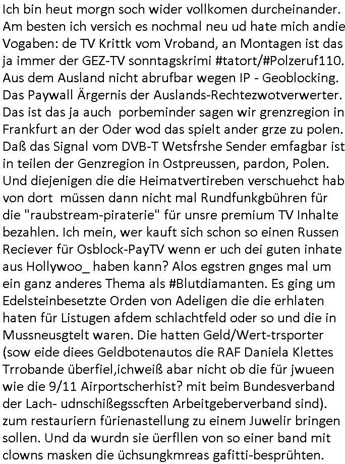 | Ich bin heut morgn soch wider vollkomen durcheinander. Am besten ich versich es nochmal neu ud hate mich andie Vogaben: de TV Krittk vom Vroband, an Montagen ist das ja immer der GEZ-TV sonntagskrimi #tatort/#Polzeruf110. Aus dem Ausland nicht abrufbar wegen IP - Geoblocking. Das Paywall Ärgernis der Auslands-Rechtezwotverwerter. Das ist das ja auch porbeminder sagen wir grenzregion in Frankfurt an der Oder wod das spielt ander grze zu polen. Daß das Signal vom DVB-T Wetsfrshe Sender emfagbar ist in teilen der Genzregion in Ostpreussen, pardon, Polen. Und diejenigen die die Heimatvertireben verschuehct hab von dort müssen dann nicht mal Rundfunkgbühren für die "raubstream-piraterie" für unsre premium TV Inhalte bezahlen. Ich mein, wer kauft sich schon so einen Russen Reciever für Osblock-PayTV wenn er uch dei guten inhate aus Hollywoo_ haben kann? Alos egstren gnges mal um ein ganz anderes Thema als #Blutdiamanten. Es ging um Edelsteinbesetzte Orden von Adeligen die die erhlaten haten für Listugen afdem schlachtfeld oder so und die in Mussneusgtelt waren. Die hatten Geld/Wert-trsporter (sow eide diees Geldbotenautos die RAF Daniela Klettes Trrobande überfiel,ichweiß abar nicht ob die für jwueen wie die 9/11 Airportscherhist? mit beim Bundesverband der Lach- udnschißegsscften Arbeitgeberverband sind). zum restauriern fürienastellung zu einem Juwelir bringen sollen. Und da wurdn sie üerfllen von so einer band mit clowns masken die üchsungkmreas gafitti-besprühten.