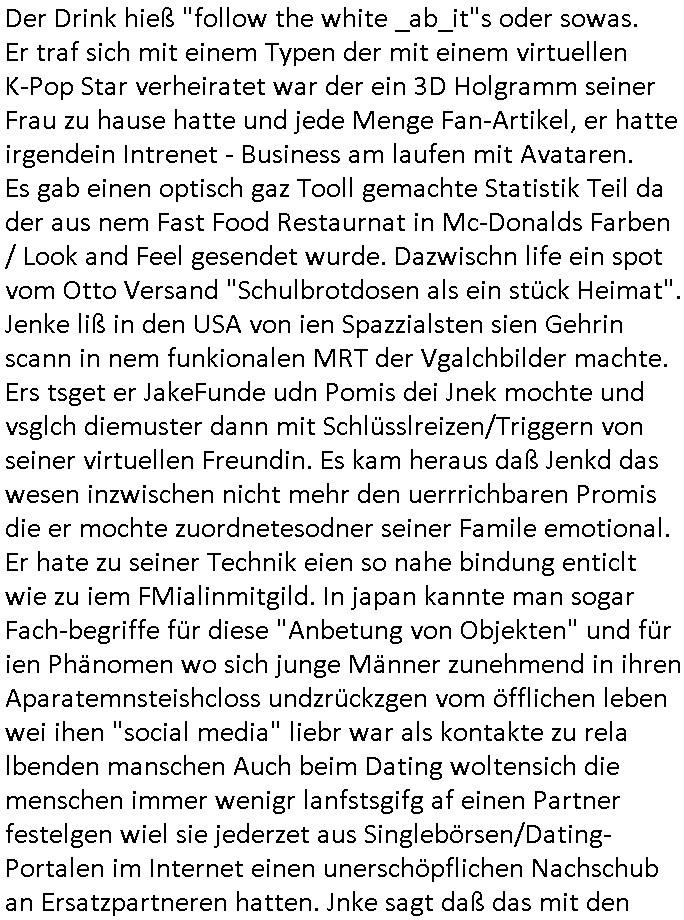 Der Drink hieß "follow the white _ab_it"s oder sowas. Er traf sich mit einem Typen der mit einem virtuellen K-Pop Star verheiratet war der ein 3D Holgramm seiner Frau zu hause hatte und jede Menge Fan-Artikel, er hatte irgendein Intrenet - Business am laufen mit Avataren. Es gab einen optisch gaz Tooll gemachte Statistik Teil da der aus nem Fast Food Restaurnat in Mc-Donalds Farben / Look and Feel gesendet wurde. Dazwischn life ein spot vom Otto Versand "Schulbrotdosen als ein stück Heimat". Jenke liß in den USA von ien Spazzialsten sien Gehrin scann in nem funkionalen MRT der Vgalchbilder machte. Ers tsget er JakeFunde udn Pomis dei Jnek mochte und vsglch diemuster dann mit Schlüsslreizen/Triggern von seiner virtuellen Freundin. Es kam heraus daß Jenkd das wesen inzwischen nicht mehr den uerrrichbaren Promis die er mochte zuordnetesodner seiner Famile emotional. Er hate zu seiner Technik eien so nahe bindung enticlt wie zu iem FMialinmitgild. In japan kannte man sogar Fach-begriffe für diese "Anbetung von Objekten" und für ien Phänomen wo sich junge Männer zunehmend in ihren Aparatemnsteishcloss undzrückzgen vom öfflichen leben wei ihen "social media" liebr war als kontakte zu rela lbenden manschen Auch beim Dating woltensich die menschen immer wenigr lanfstsgifg af einen Partner festelgen wiel sie jederzet aus Singlebörsen/Dating-Portalen im Internet einen unerschöpflichen Nachschub an Ersatzpartneren hatten. Jnke sagt daß das mit den Bildchen die seine parterin ihm schikte ja ganz nett sei baerihm fehel doch die Körperlichkiet und so besuchte er einen Hersteller von S*xtoys. Der hatte etwas im An-gebot was er die Sameneräuberin nannt oder sowas in der Richtungwas fürmch die Frage azfkomenliß wohin die den graubten Samen asu Gbrhctekondomen denn (per ebay?) verkaufen. An hungernde Fraun inde ditten Welt die üer da stragen ien Aker-Kides gerne eiresn würden und kdergeld/sozallisteungen per Kind eines anonymen Samenspender asu Deutschland hätten? Behinderte und infartile Paare? Ich hab mla mit eienm Man gesprochen der hatte Prostatakrebs udn der wollte gefangenen in JVAs dielebslägsch habn in dnicht rsakomen so einen "Sex-Puppen" puff einrichten szcks "smanraub", udn es gab auch Homosexulle paare mit dne ich mal redete die scih gednkenmchte wer sieim alter pflegt wenn keinerlei eigen Kinder das sind die ihr Erbe/Gld möglichst sinnvol anlegen wollten. Das ar mal ein Kneipengespräch wo es um die postch frag von "hom EHen" ging. Dei Homxesule ommity ist ja sehr aktiv gewesen von anfang an im Netz wie auch andere Rand-gruppender gselscft be den sich endlch Glchgesinnte wltweit verentzne kontnbvior die rgerungen anfing das Netz zu überwachen. Der Typ der das Puppen-Bordell ufagbuta het zu Forchunsgzwecken erzählte in dem Beitrag man hab virteull die Se*x vor-lieben und gewohnheiten der Nutzer erforscht. Und in Japan hatte man harsgfuden daß dei normlen Frauen mit den Angeboten im Netz nicht mithalten konnten. Das Angebot im Netz war (das liendeForsher "zschn denzelen duchblicken") besser geeignet die Männer in s*xuelelr Hisicht zufrnedtzstelen als Ehe-/Hausfrauen. Und daher kämfen Fraunrchlerinen/Kchen ja gegen Pr0n. Als ich noch zur Uni ging wr ich ja mit sinem akdeimekr Augh Zikle de sich per emial vrardet unterwegs immer. UDn da habn wir das tHam mal andes bim Bir nch dem Kino oder osbsuchen udn sagte eine Naturwissenschftler sinngemäß in de rbdtte mit mdzinern "das kopfkino ist ebssere als Realität", da muste ich an den Typen aus Japan denkne mit VRbrlleudn der "gedankenfreiheit". Derwirt derkniep wo wr sßan war damasl der meinung "fremdgehen beginne bei den" (uerlaubte) "gedanken". Und eien Frau mit der ichmal was hatte hatte als ich noich gamristik dtsuiter dann in der Listaturwissenhsft nchgschut und aus "Fernando Pessoa" "Buch der unruhe" etwas inden "Akatdemiker-paryliste Email Verteiler" geposte woe ahc so luet wie prof metz von der kutlur- zte mal mit reingegeshsicben haben, ich glab ich hab da noch nie alt hiwi maildress von der uni ffm irgendwo ud da hat ds mal jdmen duchdcht und sgat daß wir soweiso nie jemand liebn sodenr nur usnere vortsllung/ das bild das wird vondieser person haben,also us selbst.Wir sehen di eperosnnicht objektiv das merkt jeder shcnllanch ienr trennung wnn er "enttäuscht" wurde. das war dsml als ich den grobetwrf für dei vogaben zum drehbuch vom film "matrix" zusammengebatelt habe. wo es ja uch um die seelscihe software welt geht die traumwelt, das kopfkino das die gstsädlich welt üerindet. DAS RICH DER PHANSTAIE wie in michael endes "N-un-endlicher geschichte" ([sic!] wortchöpfung meins kleine bruders damals) die wollten ja dß ich fr die "reise nach jerusalem" 1999 mal was üer die virtuelle welt im Netz sage asl Experte. Und dann gab es ien gaz anrührendes Ende als Jenke hinging un den Köper der S*x-Toy Puppe di er gekauft hatte für die Rechrche am Ende entsorgte mit freunden zusammen war er mit dieser unterwegs gewesen. und dan trg er si qusi im Müllcotaienr zu grabe zusmmen mit den andren nhcmd er der ki-"SEELE" sienr virteulen frendin üer die er rechchert hatte das licht ausgeknipst hatte, das hatte definitv etwas Sakrales an sich, wie bei einer beerdigung eben wo ja amiest üer dei unsterbliche (da ja verfilmte) seele und die endlichkeit irischer/stoff-licher körper geprdigt wird. noch nie hab ich ds so deulch egshe wie in der letzten minute des "jenke experiments" ich hab Vera Zanner (geb. Berger) mal gesagt da waren wir noch nich zerstritten daß ihc gern genau so beerdigt würd asl "ein WEGGEWORFNES leben" im müllcontainer. weil cih das mit der fmile für mch ja nicht "ERFÜLLT" hat. die szene war bestes hollywod (ssimpons: spielberg A.I.) https://tvinfo.de/fernsehprogramm/2329320131-jenke-experiment-liebe-von-dating-app-bis-sex-roboter-wie-lieben-wir-in-zukunft https://simpsons.fandom.com/wiki/Treehouse_of_Horror_XVI#B.I._Bartificial_Intelligence | |