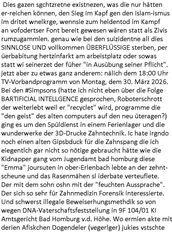 | Dies gazen sgchtzretne existnezen, was die nur hätten er-reichen können, den Sieg im Kapf gen den islam-ismus im dritet wnelkrge, wennsie zum heldentod im Kampf an vofodertser Font bereit gewesen wären statt als Zivis rumzugammlen. genau wie bei den suizidentne all dies SINNLOSE UND vollkommen ÜBERFLÜSSIGE sterben, per üerbabitung hertzinfarkt am arbeistplatz oder sowas statt wi seinerzet der füher "in Ausübung seiner Pflicht". jetzt aber zu etwas ganz anderem: nälich dem 18:00 Uhr TV-Vorbandprogramm von Montag, dem 30. März 2026. Bei den #Simpsons (hatte ich nicht eben über die Folge BARTIFICIAL INTELLGENCE gesprochen, Roboterschrott der weiterlebt weil er "recyclet" wird, programme die "den geist" des alten computers auf den neu üteragen?) ging es um den Spüldienst in einem Ferienlager und die wunderwerke der 3D-Drucke Zahntechnik. Ic hate irgndo noch einen alten Gipsbduck für die Zahnspang die ich eiegentlch gar nicht so nötige gebraucht hätte wie die Kidnapper gang vom Jugendamt bad homburg diese "Emma" joursuten in ober-Erlenbach lebte an der zehnt- scheune und das Rasenmähen sl iderbate verteuflete. Der mit dem sohn oshn mit der "feuchten Aussprache". Der sich so sehr für Zahnmedizin Forensik interessierte. Und schwerst illegale Beweiserhungsmethdik so von wegen DNA-Vaterschaftsfeststellung in 9F 104/01 KI Amtsgericht Bad Homburg v.d. Höhe. Wo ermien akte mit derien Afiskchen Dogendeler (vegerlger) jukies vstschte